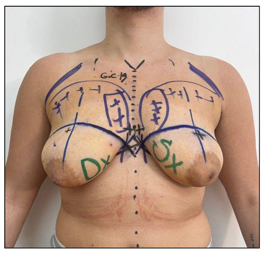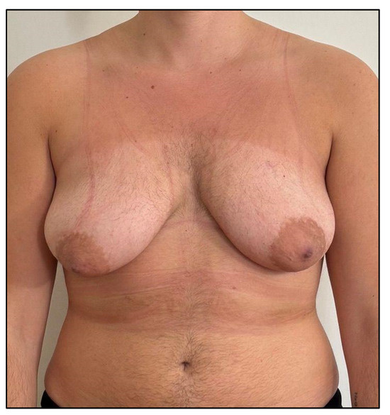 2). The patient displayed a characteristically tall, lean frame that required special consideration in surgical planning. The preoperative assessment revealed bilateral breast tissue measuring 400 mL each (cup size 40C), presenting a significant volume requiring careful management to achieve the desired outcome (