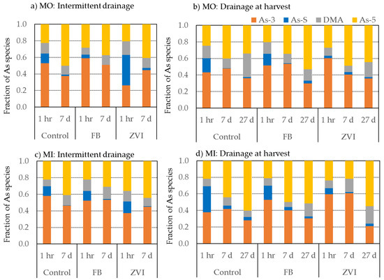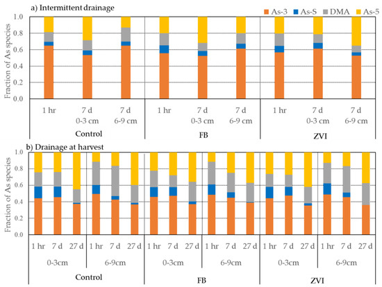 After drainage at harvest, the fractions of As-S in the MO and MI decreased with increasing time (Figure 3b,d). This decreasing trend was similar to that observed for the RZ. Although the fraction of As-S was highest for the MO from the ZVI-amended pot 1 h after intermittent drainage, it was lower than that of the control and the FB-amended pot 1 h after drainage at harvest. The As-3 fraction in the MO and MI from the control pot did not show considerable changes with time, whereas it decreased for the FB- and ZVI-amended pots. After 27 days, the As speciation in the MO and MI was similar in the FB-amended pots, whereas the proportion of As-5 was higher in the MI than in the MO for the control and the ZVI-amended pots. Nearly 10% of the As in soil was assigned to DMA, and the fraction of DMA tended to be higher 27 days after drainage at harvest.
