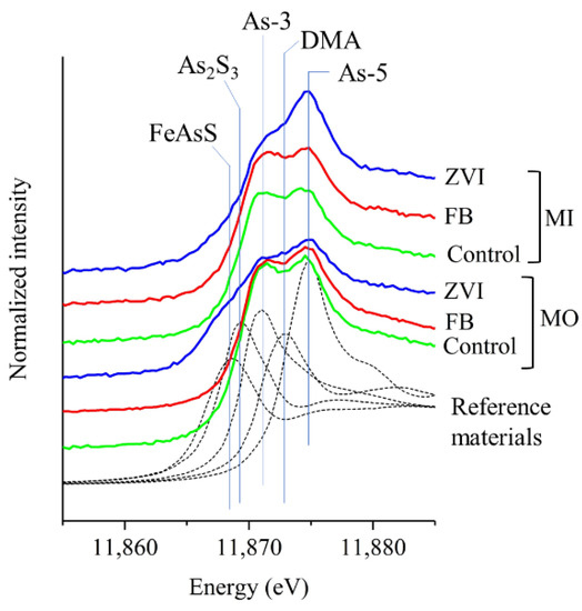 The fraction of As-5 exhibited a time-dependent increase after drainage (Figure 3 and Table S4). There was not a large difference among the speciation of As in the MO and MI after intermittent drainage, except for the ZVI-treated soil that was sampled 1 h after drainage (Figure 3a,c). The XANES spectra of the MO collected from the ZVI-amended pot had a shoulder of approximately 11,865 to 11,870 eV (Figure 4). One hour after intermittent drainage, 37% and 17% of As species in MO and MI taken from the ZVI-amended soil was assigned to As associated with sulfur (As2S3 and arsenopyrite), respectively, whereas 5–12% of As was assigned to As-S for the control and FB-amended soil. We did not evaluate the fraction of As2S3 and arsenopyrite separately, but the sum of their fraction was shown as As-S. Seven days after intermittent drainage, the fraction of As-S decreased regardless of the application of the Fe amendment.