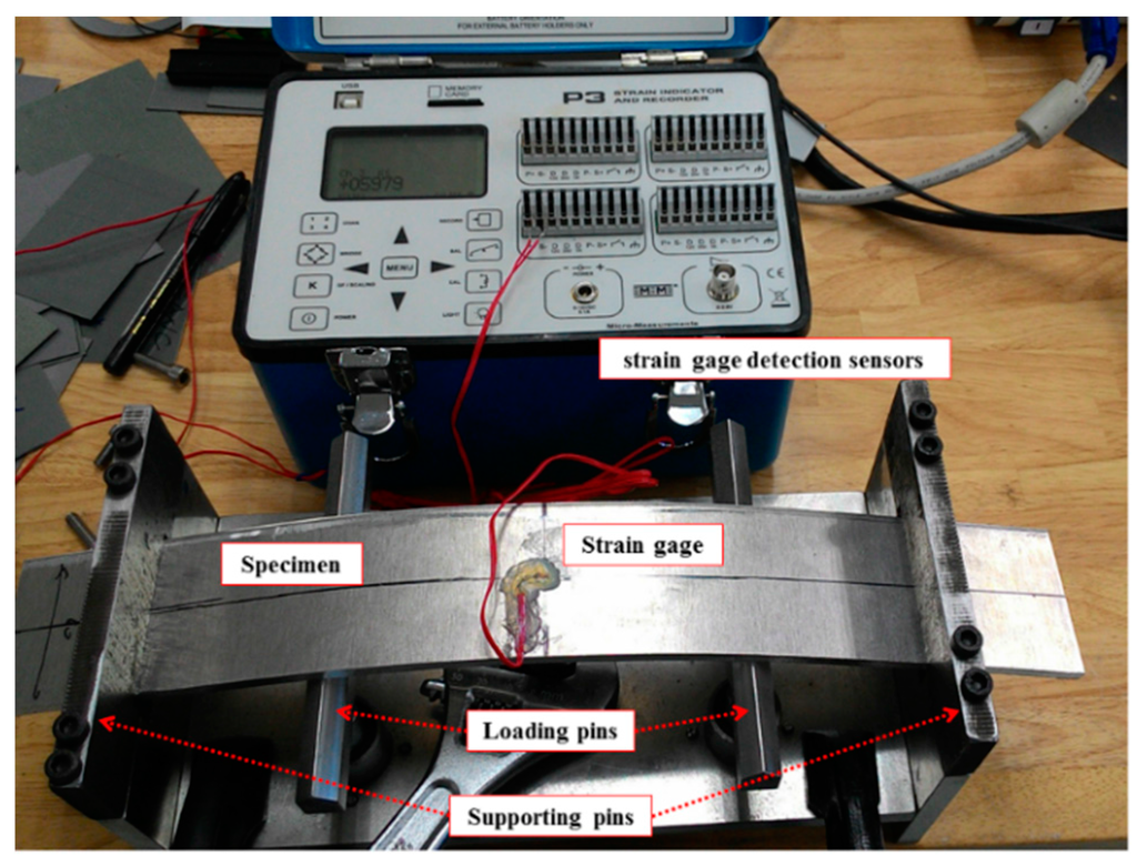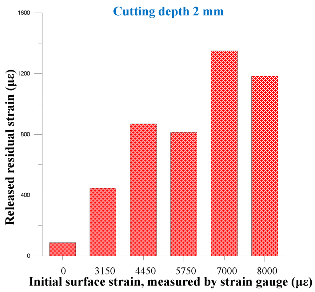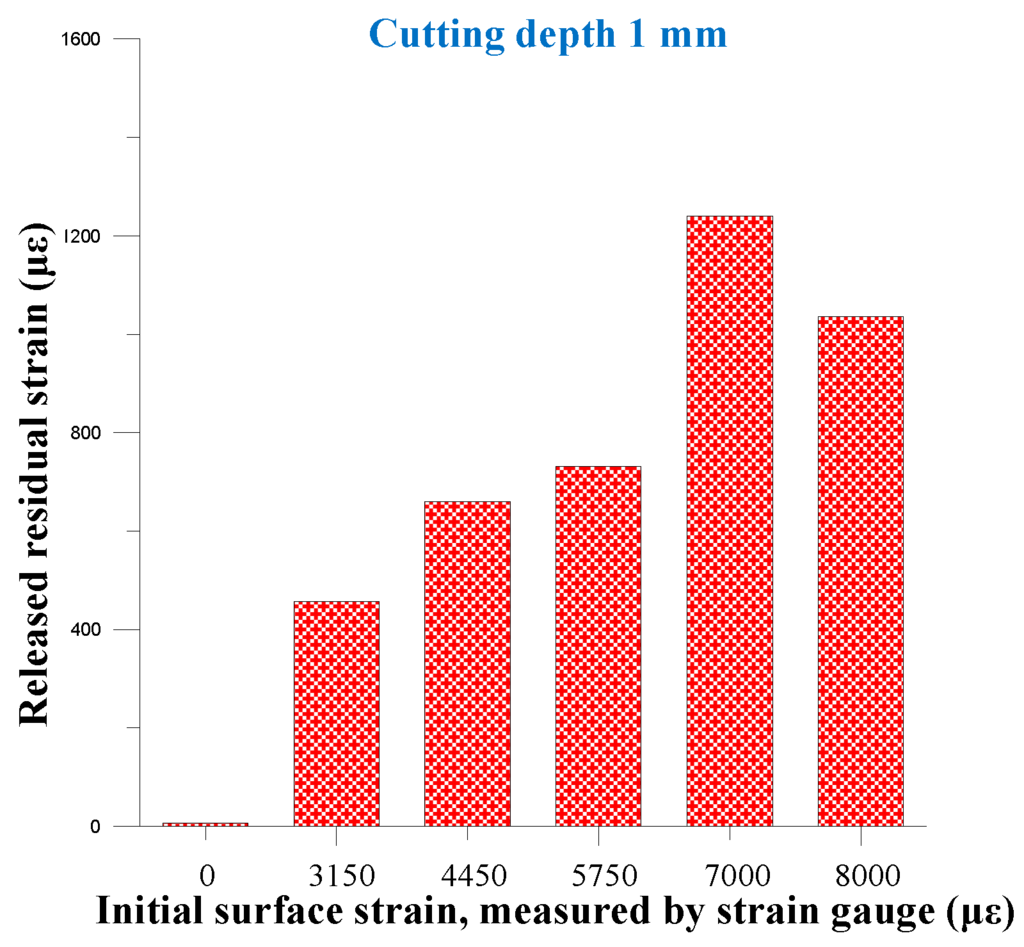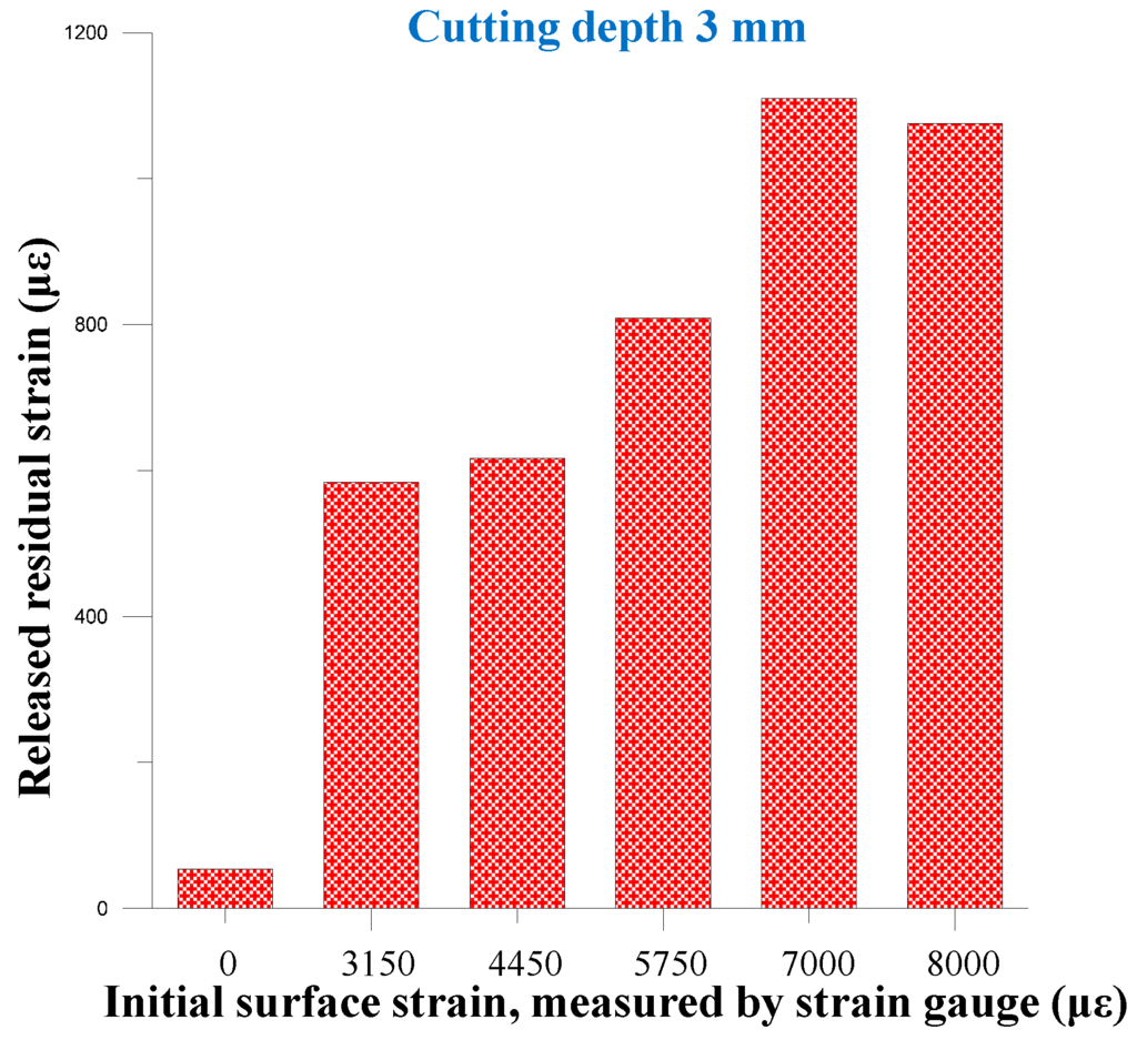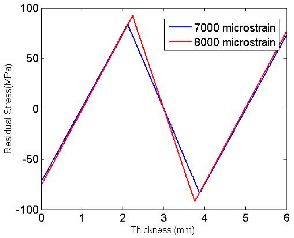 Figure 11, Figure 12 and Figure 13 show that the specimens with different strains have different average released strains for the same cutting depth. However, we find that the specimen with a strain of 7000 με had a higher average released strain than that of the specimen with a strain of 8000 με since the excessive stress levels in the metal may generate plastic deformation and result in less release of the elastic strain when the grooves were cut. Figure 14 shows the bending-moment–strain curve obtained by four-point bending. The loading force is very similar when the strain is between 7000 με and 8000 με. Figure 15 shows the simulated results using the ABAQUS finite element program; we conjecture that the residual stress versus the thickness of specimens during four-point bending is analogous for the strains of 7000 and 8000 με. Therefore, the outcome of the experimental investigation is in agreement with the simulation results.
