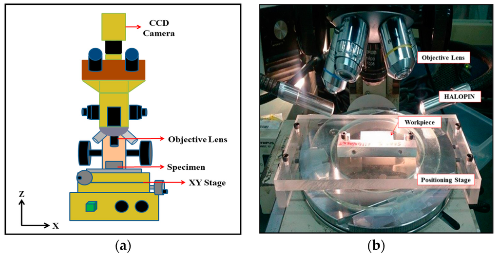 Specimens were cut from an aluminum sheet (Al 5052) with a thickness of 6 mm, and the area of specimens is 20 × 70 mm2. Four-point bending tests of the specimens were conducted along the side length. Four-point bending was used to induce a residual stress in five specimens. After four-point bending, the strains obtained by a strain gauge pasted onto the specimen surface were 3150, 4450, 5750, 7000 and 8000 με (Figure 1). Moreover, one additional specimen was prepared without a residual stress induced by the four-point bending mechanism. A Sony ExwaveHAD 3CCD color video camera (640 × 480 pixel resolution) and a Olympus U-PMTVC 8C14561 microscope (25× magnification) were used to observe the working surface of the patterned specimens during testing. The camera’s optical axis was adjusted to be orthogonal to the studied surfaces, which are illuminated by a halogen lamp (Halopin). The area of the captured pattern was approximately 2608 × 1955 µm2. DIC was performed on a selected subimage (160 × 160 pixels) of the studied surface and captured by a digital camera with a 4.07 pixel/µm resolution. In this work, the DIC algorithm set the subpixel resolution to 0.01 and the accuracy of every measured point of the displacement field to 2.5 nm. The average released strain is computed as the sum of the values of the subset divided by the total number of subsets. The distance between the different electrical discharge machine (EDM) grooves is 0.2 mm, and the width of each groove is 2 mm. Figure 2 shows a schematic of the experimental setup and the actual experimental system using an optical imaging device for the 2D DIC method. These images were analyzed by the DIC technique to extract the released strains after milling. The arrangement used for cutting specimen surfaces to release the residual strain is presented in Figure 3 and Table 1. The wire-cut electric discharge machine consists of a machine tool, computer numerically controlled (CNC) pulse generator, and dielectric-fluid supply unit. The tool consists of a main worktable, an auxiliary table, and a wire drive mechanism. CuZn37 brass wire with a diameter of 0.2 mm was employed in this study. The wire travels through the workpiece from the wire supply wheel to the wire take-up reel. In the wire-cut electrical discharge machining (EDM) process, a spark is generated between the continuously traveling wire and the workpiece.
