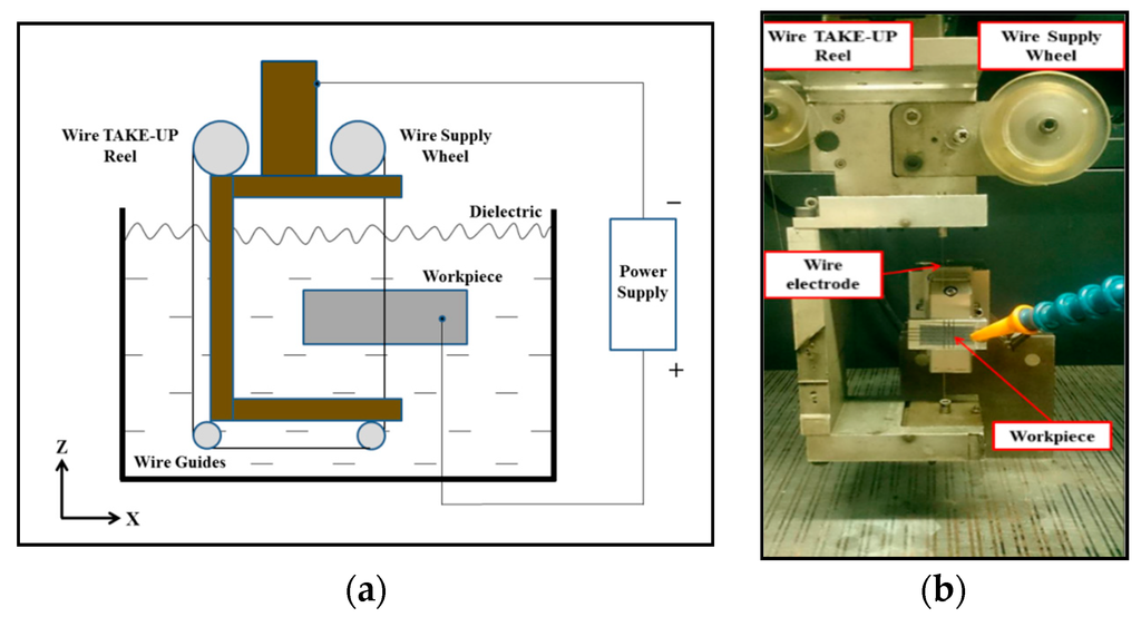 (a) Schematic and (b) photograph of the setup of the wire electrical discharging machine.