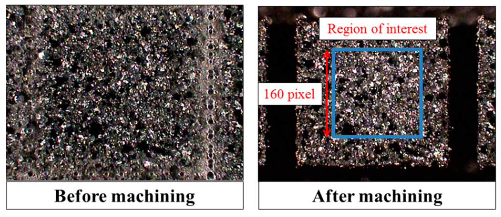 - Processing the acquired images using a DIC program to obtain the desired displacement and strain information: the DIC program compares the grey-level intensity patterns of a matrix of pixels of the images before and after machining at the subpixel locations and establishes where the reference matrix has to be shifted from the first image to the second image to find the best matching pattern. Then, we implement a pointwise local least-squares method to estimate the strains from the displacement fields computed by the DIC method.