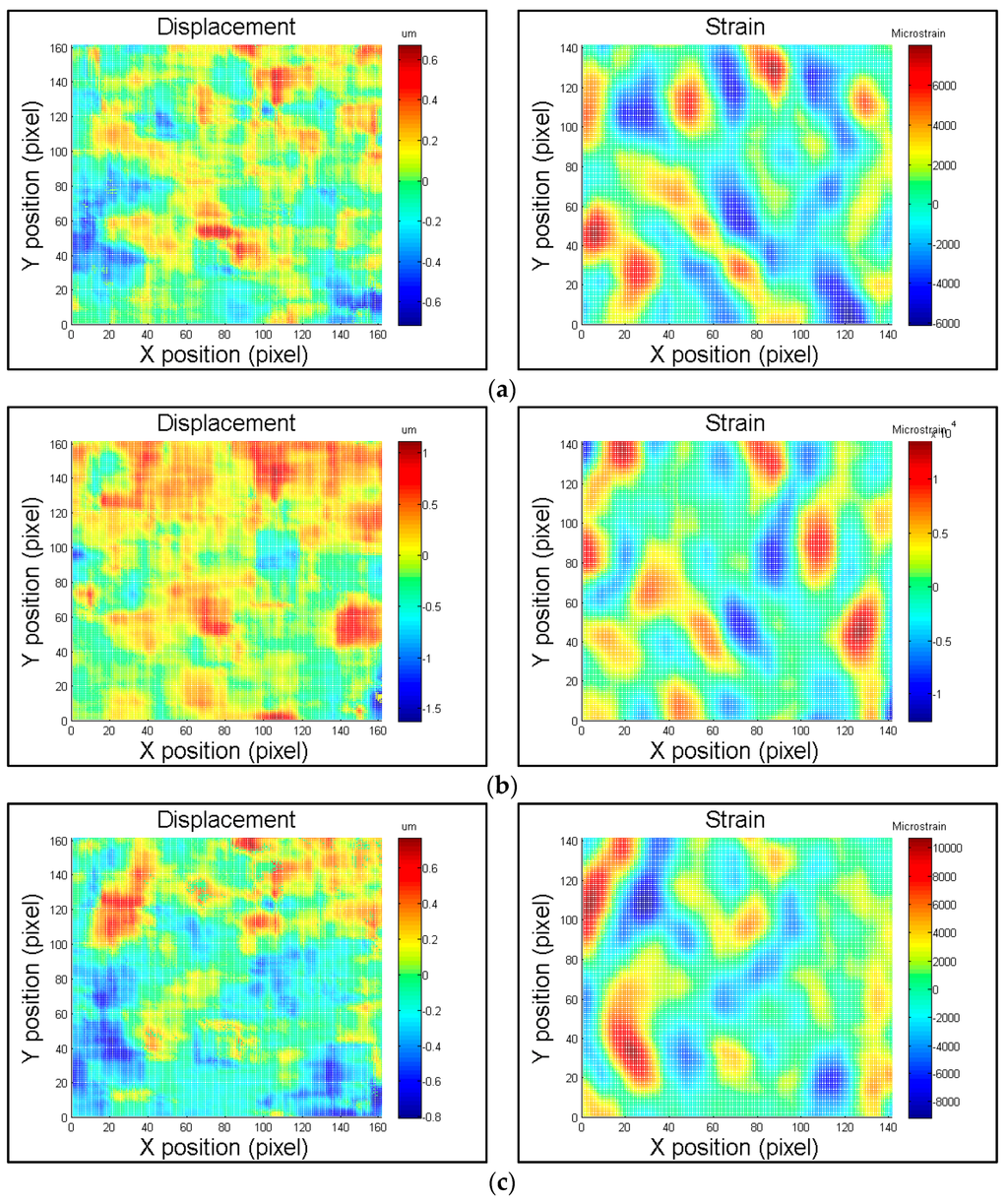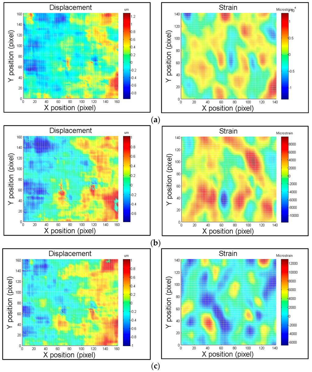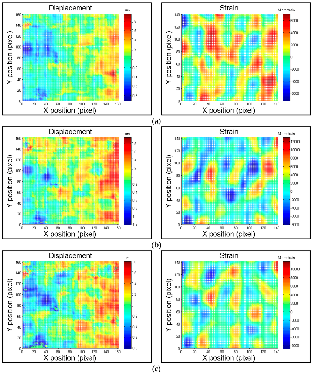 Figure 5, Figure 6, Figure 7, Figure 8, Figure 9 and Figure 10 show the displacement and strain fields in the x direction (along the side length) obtained by the correlation of two images for the residual stress of six different specimens. It is shown that the average released strain is the smallest for the specimen that was not prepared with four-point bending. Furthermore, the results for the other specimens exhibit higher average released strains owing to the induced residual stress produced by four-point bending. A higher average released strain is obtained for a specimen with a higher strain measured by the strain gauge. However, it is observed that released residual strain fields in the x direction are randomly distributed owing to the occurrence of a local out-of-plane displacement, resulting in the distortion in the reported displacements.