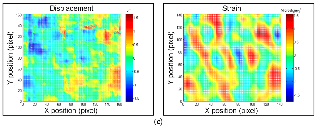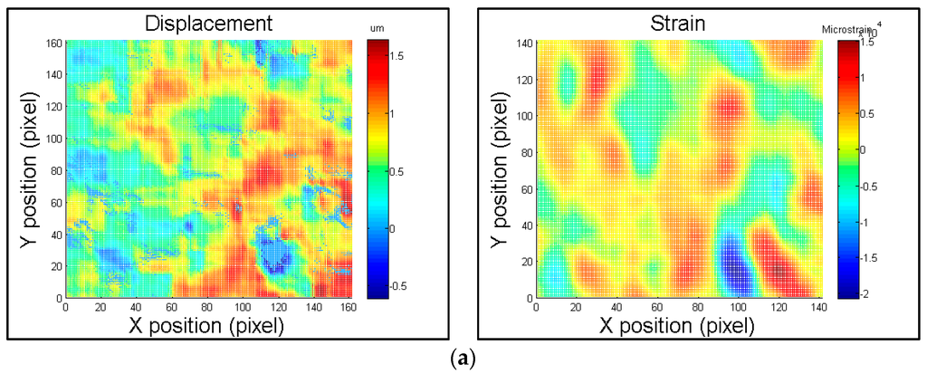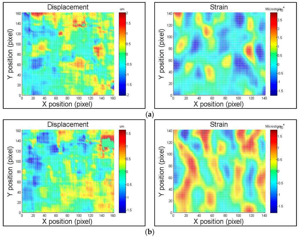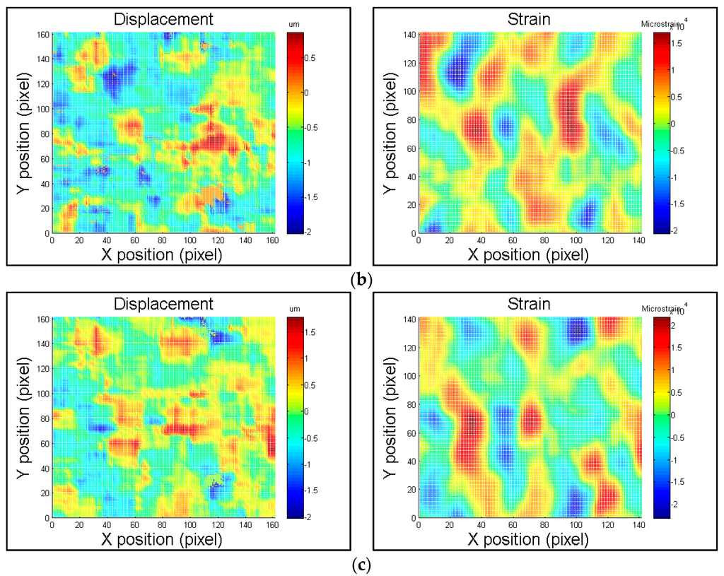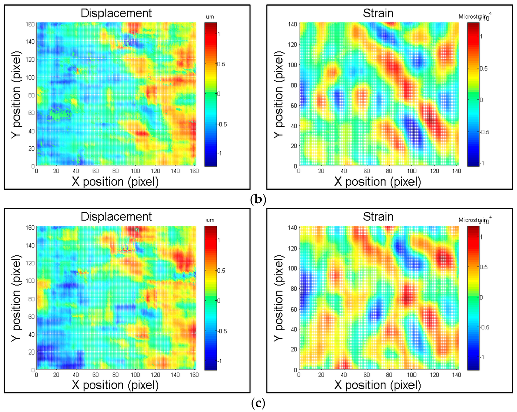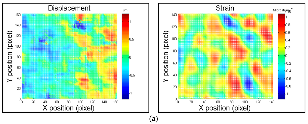 Figure 5, Figure 6, Figure 7, Figure 8, Figure 9 and Figure 10 show the displacement and strain fields in the x direction (along the side length) obtained by the correlation of two images for the residual stress of six different specimens. It is shown that the average released strain is the smallest for the specimen that was not prepared with four-point bending. Furthermore, the results for the other specimens exhibit higher average released strains owing to the induced residual stress produced by four-point bending. A higher average released strain is obtained for a specimen with a higher strain measured by the strain gauge. However, it is observed that released residual strain fields in the x direction are randomly distributed owing to the occurrence of a local out-of-plane displacement, resulting in the distortion in the reported displacements.
