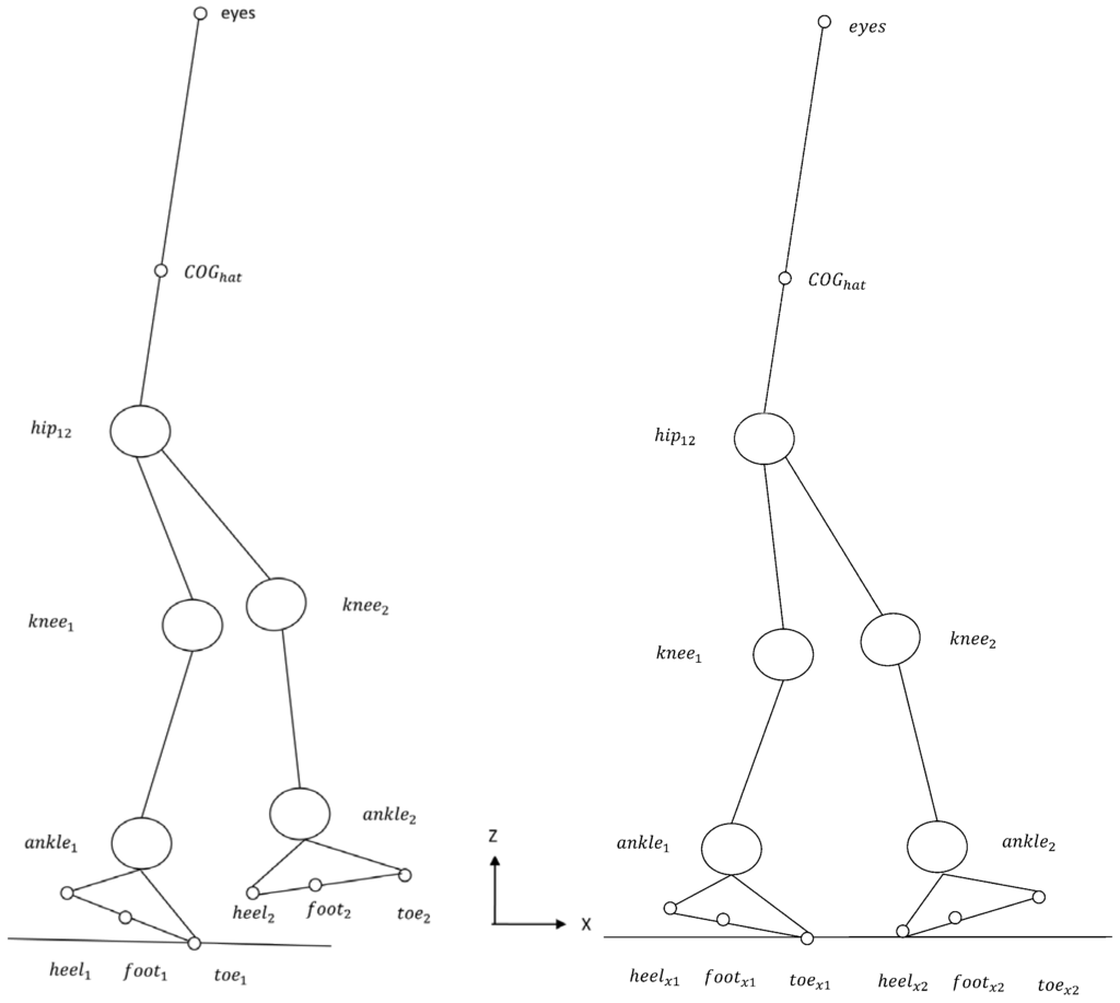 Indicate with pedix 1 the right leg and pedix 2 the left leg, and use conventionally foot 1 as the supporting foot. The two configurations of single and double stance are defined as follows: