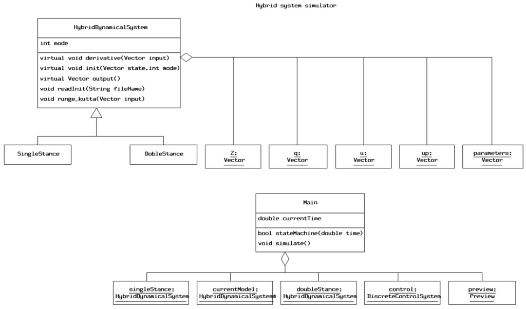 The main class has as member variables one instance of each phase class (SingleStance, DoubleStance) of the system, a pointer to the , a to generate the reference trajectories, and a class to generate the control inputs. It runs the simulation from initial to final instants with two threads: one, event driven (, ), controlling the phases and modes through a state machine, depicted in Figure 5, the other with a given fixed sampling time closing the control loop. Samples of Autolev Code Fragments for building the model and generate the C++ code are presented in Appendix A.