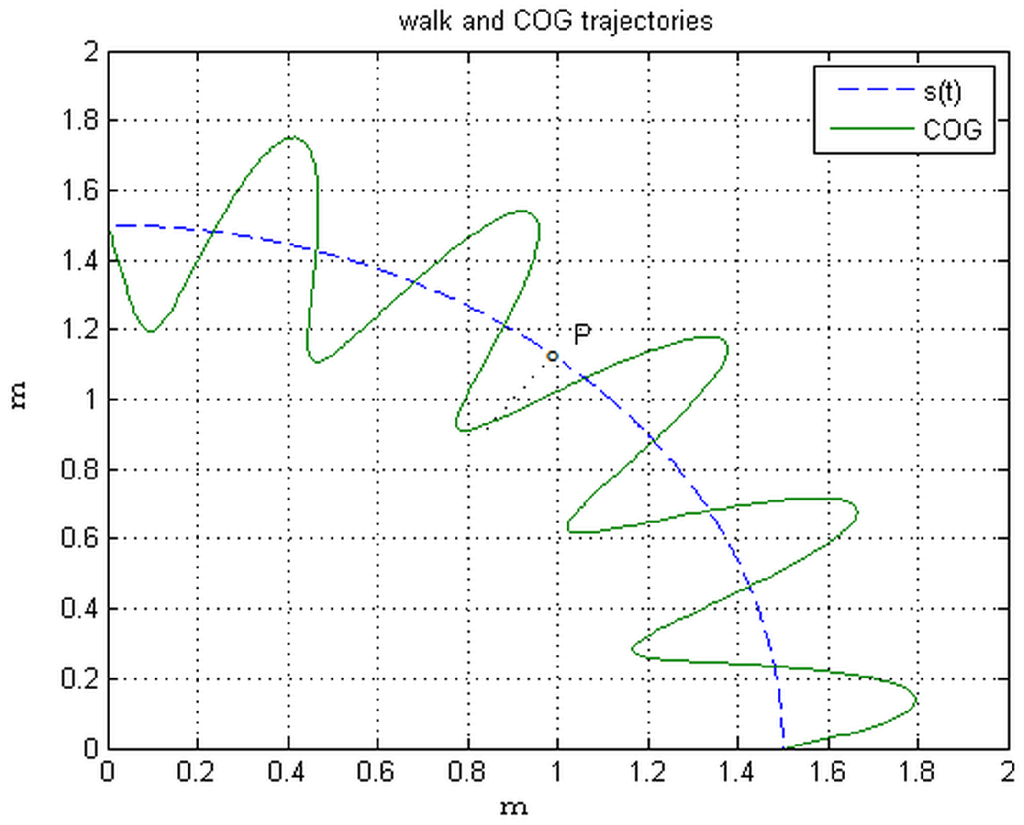 Our approach belongs to this second category of preview tracking, but unlike previous works, it is based on a running local reference frame with respect to which the robot maintains rectilinear walk, to rotate this frame and move its origin with respect to the world coordinates to follow an involute of the path curve during turns. The postural and gait control of the robot is obtained defining and tracking Cartesian trajectories on this moving frame, adopting the appropriate (i.e., from the joint space to the local moving frame—this is simple using Autolev, as it offers efficient mathematical expressions to be used in real time control for all the necessary kinematic relationships) Jacobian matrix to transfer these trajectories to the joint space.