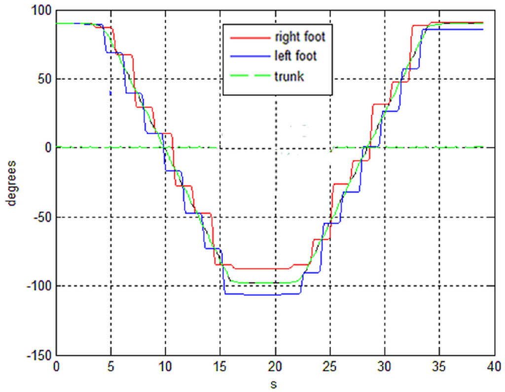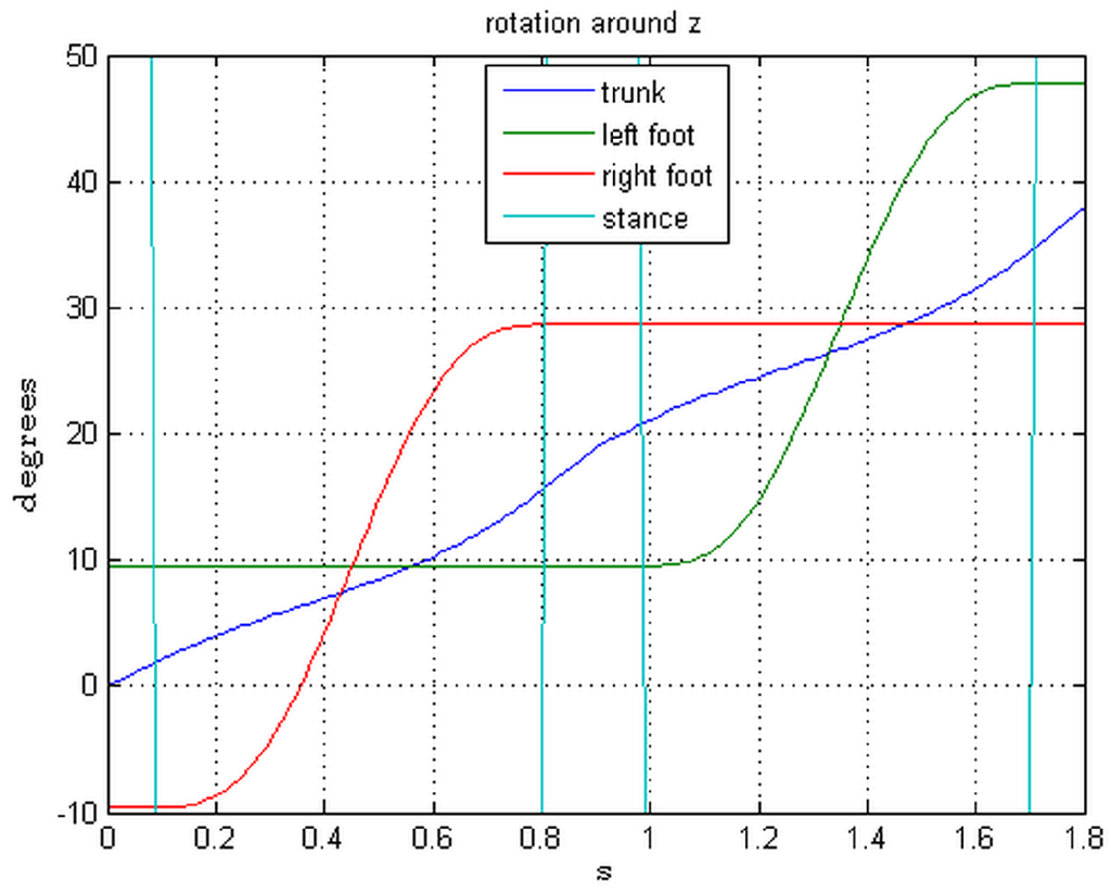To maintain the pace of turn, a standard bell shaped pattern is adopted during the period of swing for the angle velocity of each foot, and its amplitude is controlled in real time by feedback, to ensure during a step that the mean of the angles of the two feet follows the trunk angle. The result is shown in Figure 3. The small misalignment between trunk and feet angles is due to the feedback sampled at each step period.