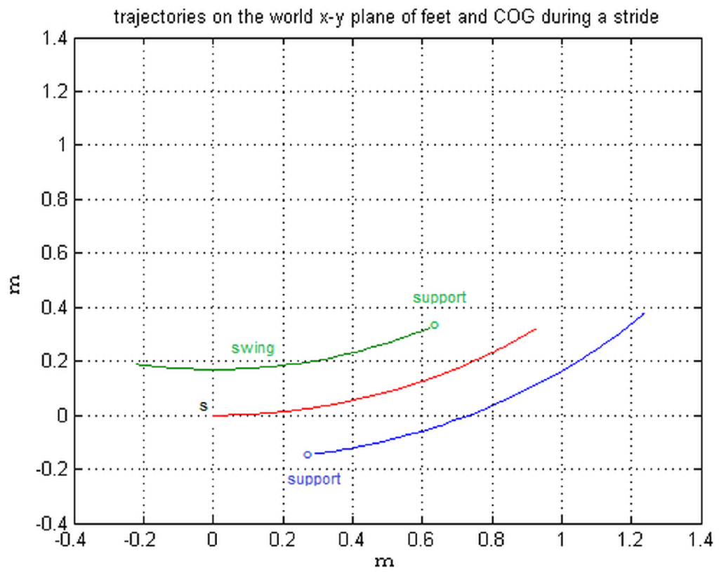 Trajectories of feet (green and blue) and COG (red) on the plane for an ideal circular stride.