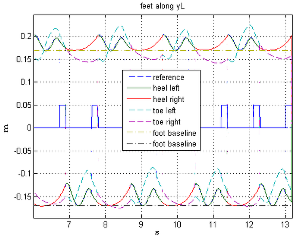 The coordinates of the feet are shown in Figure 8. During the swing period, the reference and its tracking can be seen. The effect of the feedback in maintaining the feet on the baseline is evident.