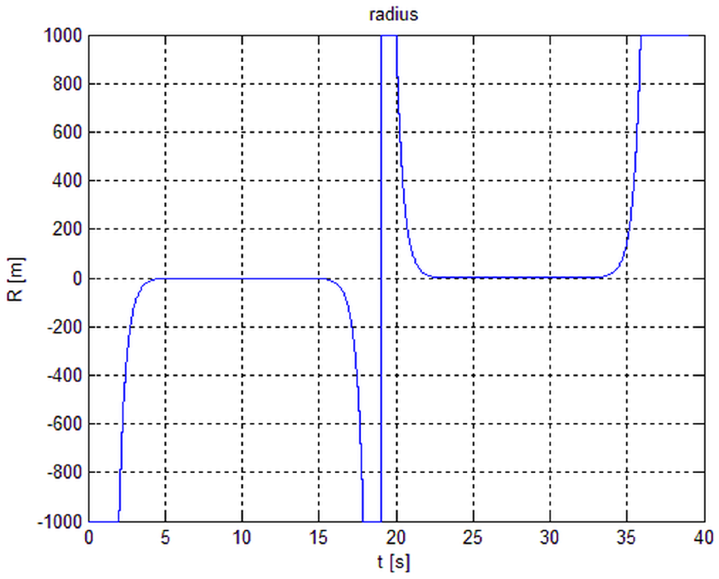 The path was obtained as described in Section 3 with a sampling period of 10 ms, a radius changing at a rate of 7.5 during the time of a step, with a minimum value of 2 m.