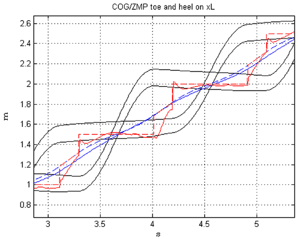 The blue line is the COG behavior (the dashed line is the reference), the red line is the ZMP, the black lines are heel and toe. The rectilinear dashed lines in Figure 14 indicate the baselines of the two feet.