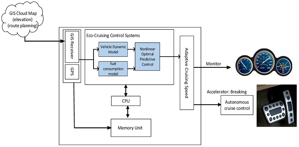 Spurred on by the oil crisis and global warming as well as considerations about traffic congestion and aging societies, most countries have started to promote renewable energy and energy efficiency in recent years, especially focusing on energy conservation and environmental protection. According to the Energy Technology Perspective 2014 [1] published by the International Energy Agency (IEA), the transport sector is responsible for around 19% of total energy consumption. The report also indicates that the fuel efficiency of vehicles should be increased once to offset the transportation needs of doubling the impact when increasing warming by two degrees; therefore, energy efficiency and low-carbon transport systems have become priority for transport policy in the future. In addition, the Organization of the Petroleum Exporting Countries (OPEC) has increased oil production causing continuous decrease in crude oil prices to avoid losing their advantage. Although there are currently sufficient oil reserves, these will be exhausted eventually. In order to slow down oil consumption and the greenhouse effect, energy-saving technology and alternative energy has become the focus of research and development in the automotive industry, such as electric vehicles, hybrid/Plug-in hybrid vehicles, fuel cell vehicles, natural gas vehicles and other types of vehicles. Plenty of new fuel cell vehicles were launched at the 2015 Tokyo Motor Show, such as Lexus LS-FCV [2], Toyota Mirai [3], BMW Hydrogen 7 [4], and Honda FCX Clarity [5]; however, all of these vehicles are concept cars and it will still be a long journey to replace the normal car. In recent years, each automotive company mainly focuses on developing safer, more environmentally friendly, more autonomous, more intelligent driving assistance systems, especially new types and renewable of energy such as hydrogen and electric power for vehicles. However, they did not consider an ecological driving assistance system to improve your car's fuel economy when vehicle on roads with up-down slopes. Therefore, this paper will design an eco-cruise control system based on digital topographical data and the proposed nonlinear optimal predictive control algorithm for eco-driving.