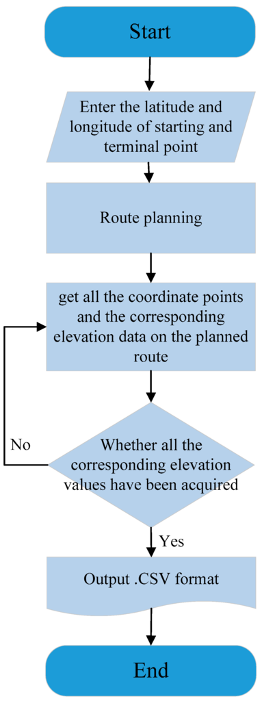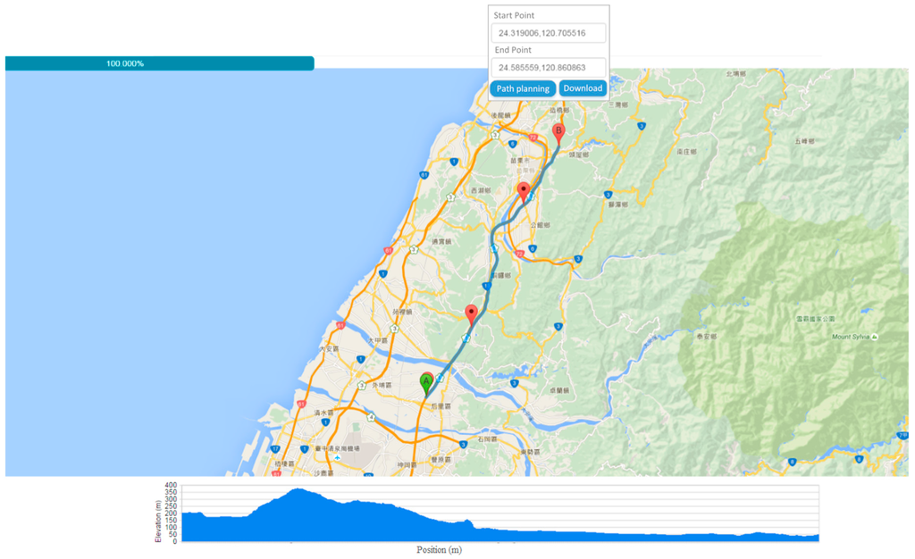 For this flowchart, we first need to enter the name of an origin and a destination or the latitude and longitude of origin and destination in our designed user interface, please see Figure 4. Then, we utilize the “Google Maps Directions API” to plan routes and to get these geographical coordinates (latitude and longitude), simultaneously. Next, according to their latitude and longitude coordinates, we apply the “Google Maps Elevation API” to obtain the elevation data for a set of locations on the planned routes. Elevation values are expressed relative to local mean sea level, which also means that altitude profile of the road in this paper. Finally, we have the whole longitude and latitude coordinates and corresponding elevation data of each location for our planned route.