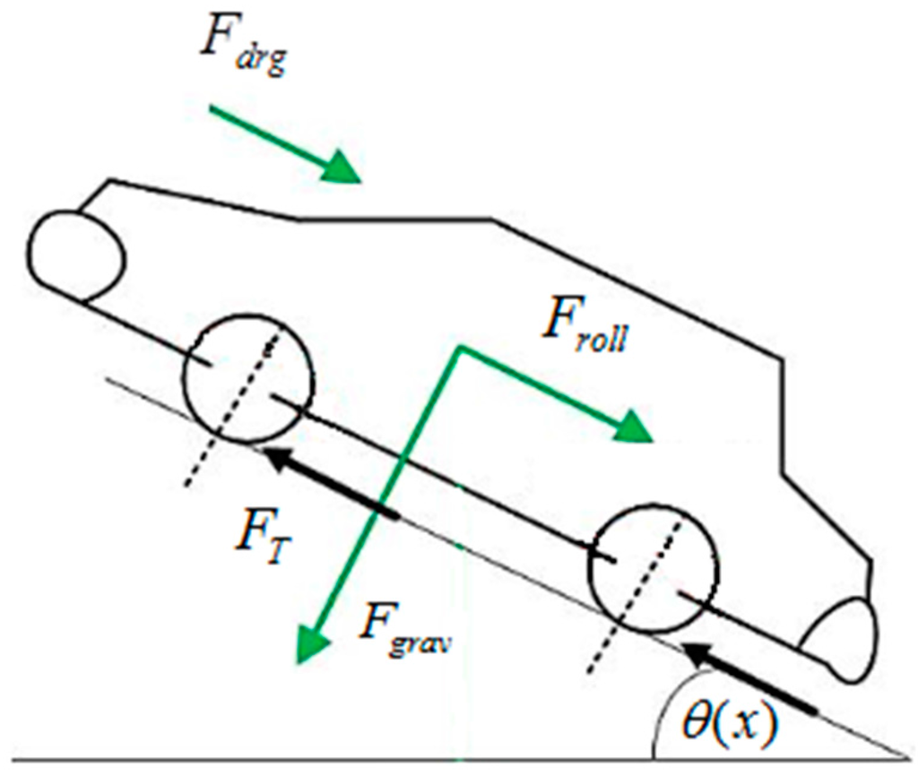 In this paper, the vehicle dynamics are expressed by the longitudinal motion of the vehicle [14] using Newton’s second law. The longitudinal forces acting on the vehicle are represented as acceleration, rolling resistance, aerodynamic drag and gravitational. These forces are shown in Figure 5. The velocity of the vehicle at any instant is subjected to the total forces acting on it, which can be modeled as below: