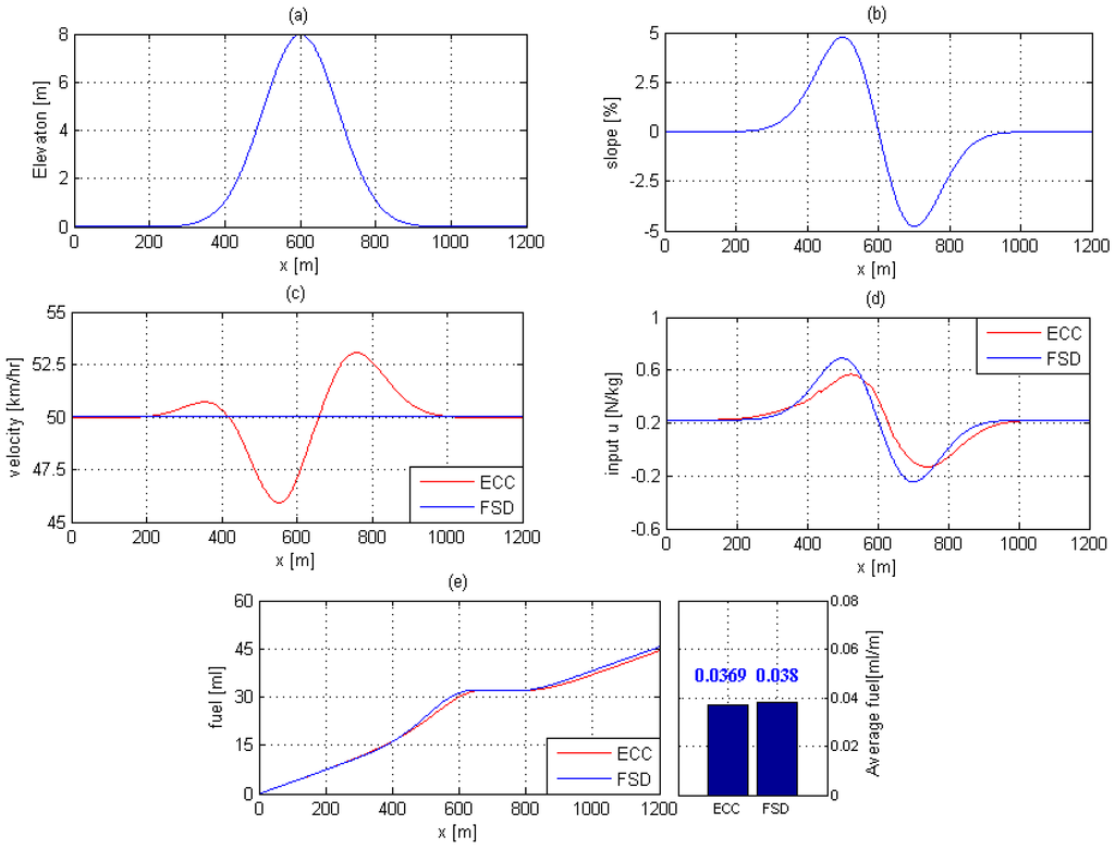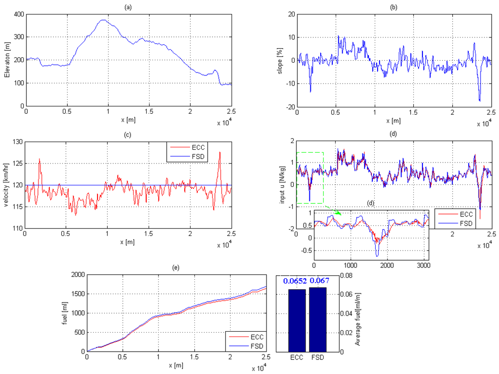 The penalty function , enforcing as the soft constraints, is penalized along with the cruising speed limit when driving the uphill or downhill. The last part is the cost of that corresponds to the transfer effect between the actuator and the driving force. Note that the proper weight selection, it can be slightly tuned by direct observation of the simulation results to minimize the fuel consumption when driving on roads with up-down slopes.