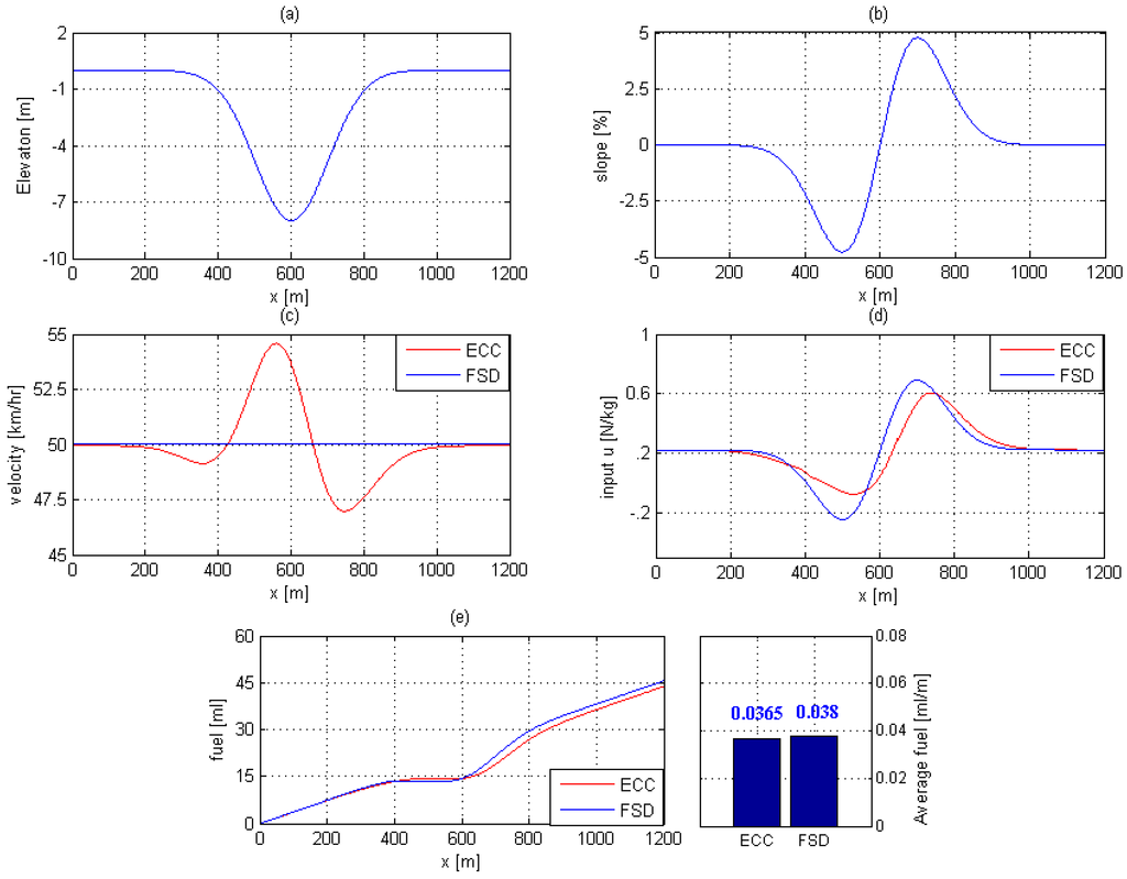 Simulated responses when the vehicle on the roads with down-up slopes: (a) road surface; (b) percentage of road gradient; (c) cruising velocity; (d) control input; (e) total fuel consumption and average fuel consumption.