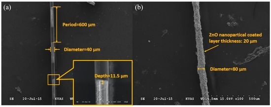 (a) SEM image of the LPFG. Inset: The notch depth of the LPFG; (b) SEM image of the ZnO nanoparticle-coated LPFG CO2 gas sensor.