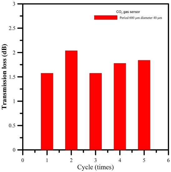 An LPFG sensor with a diameter of 40 μm and a period of 600 μm was used in this experiment. Electrostatic spraying technology was also used to apply the ZnO nanoparticle layer to detect CO2. Figure 4 shows the spectra of the sensor in repeated CO2 gas sensing experiments. We tracked the spectrum dip to monitor the variation in gas concentration and utilized the spectrum data in creating Figure 5. Figure 5 shows the repeatability of the CO2 gas sensor spectral analysis. At an initial concentration of 15% CO2, the corresponding transmission loss gradually lessened and the wavelength exhibited a slight blue shift. In the first and second cycles, the variation in transmission loss was due to the sensing layer instability. Figure 6 shows the changes in transmission loss for the CO2 sensor. The figure shows that, among the five cycles of the experiment, the second had the largest transmission loss (2.038 dB); the mean transmission loss was 1.762 dB, and the standard deviation was 0.195 dB. The response time of the CO2 gas sensor was about 6 min.