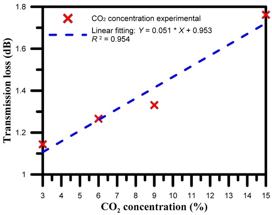 After the 600 μm period optic fiber 40 μm in diameter was completely sealed and coated in ZnO, CO2 at concentrations of 3%, 6%, 9%, and 15% were introduced for 20 min to measure the spectral changes and calculate the transmission loss variation (Figure 7). Figure 7 shows that after introducing different concentrations of CO2 gas, the transmission loss gradually decreased. The changes in loss for CO2 concentrations of 3%, 6%, 9%, and 15% were 1.144, 1.266, 1.331, and 1.762 dB, respectively. As the CO2 concentration increased, the transmission loss increased; the sensitivity was 0.051 dB/%, and the linearity was 0.954.