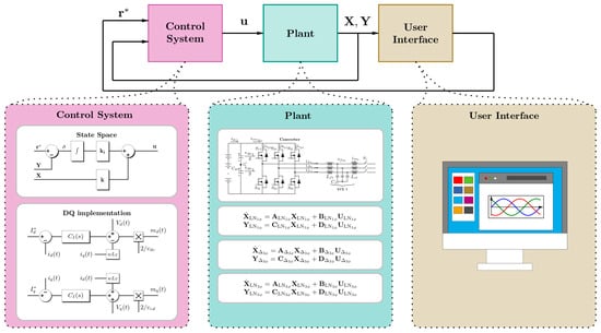 Once this plant has been selected, in this case, the inverters of the microgrid and their functions are established, and then the conceptualization of the modeling to be used as the first approach can be made. For instance, in this article, the plant is a three-phase power inverter modeled in state space. The modeling can consider delta, star, or single-phase per-phase modeling depending on the research objectives. On the left of Figure 3 is the block “control system”, highlighted in purple. Depending on the research purposes, that block can include any kind of controller, linear or non-linear, or intelligent controllers. On the right of Figure 3 is the block “User Interface”, where the calculus of references and signals deployment can be carried out.