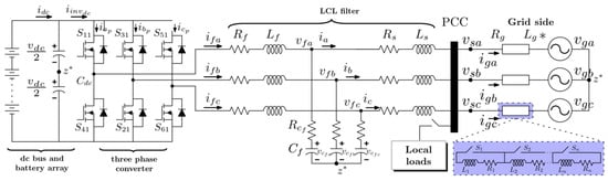 The model simulation shown in Figure 4 is a better approach than the one presented in the previous stage. The three-phase converter has a MOSFET with turn-on resistance and drain-to-source saturation voltage parameters. Although it is not a complete model, it is a better approach since this block provides the switching effect. Also, inductors with parasitic resistances and capacitors with series resistances can be observed. Another contribution to approaching a realistic scenario is the grid impedance, which can be changed on the fly to test the system’s stability.