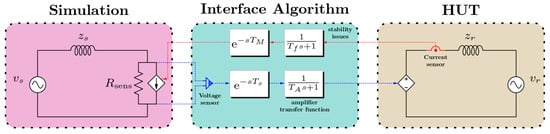 This stage is where the delays and relevant transfer functions are recommended to be included according to the diagram flow of Figure 1. Figure 5 illustrates the basic principle of interconnection between a simulation and hardware under test (HUT), considering the delays between both worlds. The circuit is based on the ideal transformer model, described in detail in [14,15,33,34]. Also, Figure 5 can be observed on the left of the simulation part, where zs is the simulated equivalent circuit, and Rsens is a considerable resistance used for simulation stability. The interface algorithm considers, on the one hand, the delays due to the time step Ts, and the measurements delay TM.