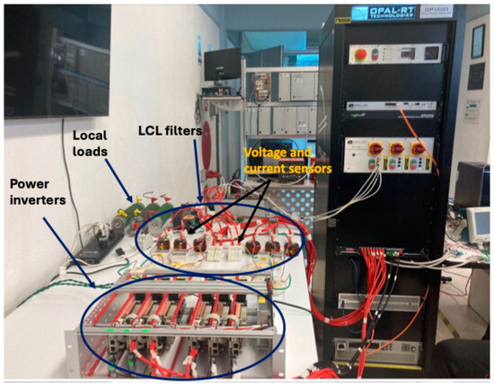 From Figure 8, the elements that constitute the PHIL simulation based on OPAL-RT can be seen. From the left to the right, the first element that can be seen is the power inverters. They are two three-phase inverters IMPERIX-based modules PEB8024, 1200 V, 36 A SiC MOSFETS. Following to the right, it can be observed the local loads are resistances used for heating with a capability of 1 kW at 120 V. The following elements are the LCL filters. A combination of magnetic and air cores for the inductors can be observed. This is because the magnetic core being available during the experiments was limited. The capacitors used were based on polypropylene 400 V. After that, the current DIN 50 IMPERIX (±50 A) and DIN 800 IMPERIX (±800 V) sensors are indicated using orange letters. Finally, the OPAL-RT device is connected to the hardware using red ethernet cables, which can be seen on the right.