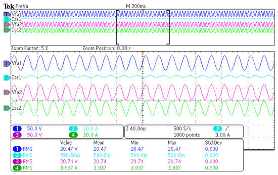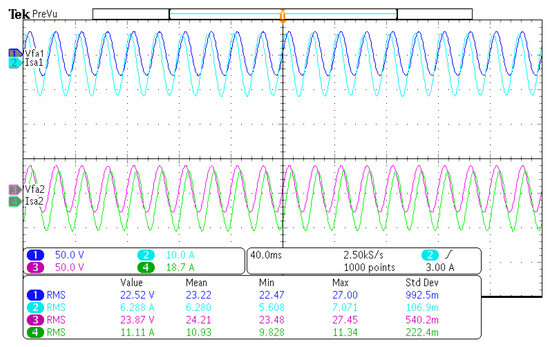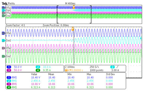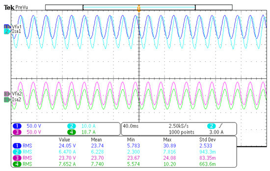 Figure 10 shows a steady-state result where inverter one contributes 12.25 VAR. In contrast, inverter two contributes 81.65 W. Figure 11 shows a decoupled transient state where only inverter one experiments with an active power step from 0 W to 45.19 W while the reactive power is maintained at 0 VAR. Inverter two is kept in a steady state with the active power at 117.8 W while the reactive power is at 0 VAR. Figure 12 and Figure 13 show the capability of contributing with apparent power. In Figure 12, inverter one contributes with a lead current (more capacitive), while inverter two has a lag current (more inductive). Figure 13 shows both inverters contributing to lag current (more inductive).