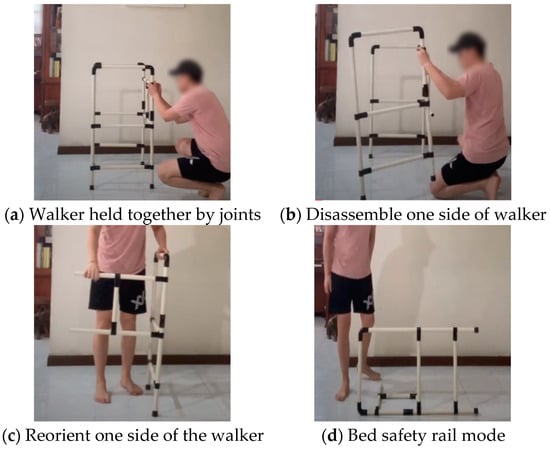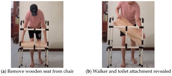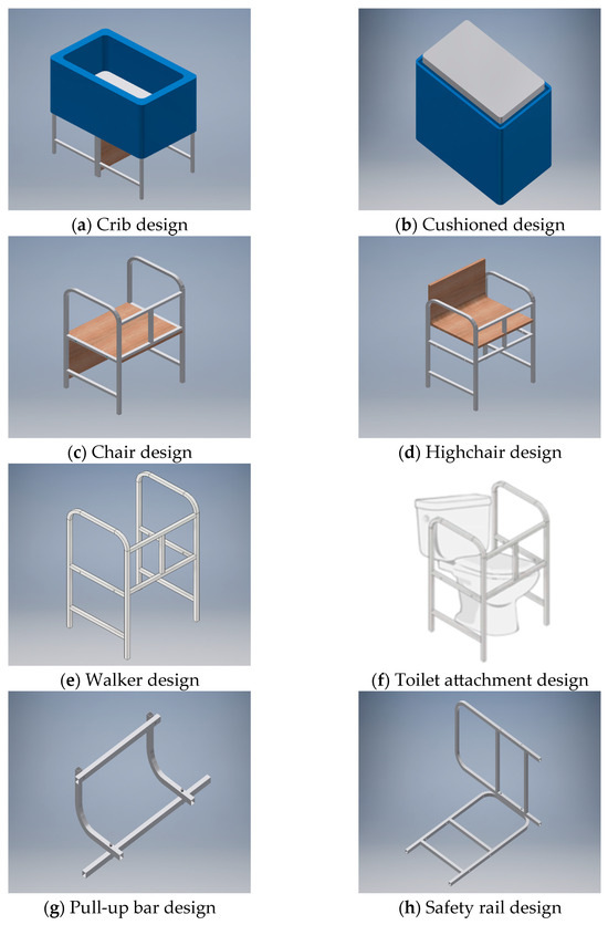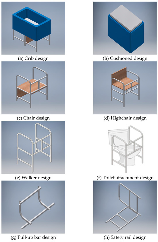 Five design concepts have been developed through researching patents and journal papers that comprised various products such as children’s furniture, conventional furniture, and everyday products. Then, concept screening and scoring were conducted as previously reported [3]. As a result, Concept 1 was selected as shown in Figure 1. The primary function of this concept includes a baby’s crib as shown in Figure 1a. The crib provides a safe and comfortable space for the baby to rest and sleep in. Once the baby has outgrown the crib, the crib frame can be removed and repurposed as a cushioned seat as shown in Figure 1b. Once the storage box is removed, it reveals two repurposed chairs (two chairs of the same design) as shown in Figure 1c. The chairs provide a comfortable area for sitting and resting in general. Each of these chairs can be repurposed to a highchair as shown in Figure 1d. The highchair is suitable for a young child. It provides a safe area for the child to sit on during meals. Once the highchair has exceeded its useful life cycle, it can be repurposed into a walker as shown in Figure 1e by removing the wooden panels. The walker is appropriate for the elderly or disabled because it provides additional support in walking activities [10]. The walker can be repurposed as a toilet attachment as shown Figure 1f. The toilet attachment is mounted around the toilet bowl. It provides handlebars that allow for ease of getting on and off the toilet. In addition, it can be used to pull oneself up after slipping, as there are handlebars on the side of the toilet attachment. Once the toilet attachment has reached the end of its life cycle, it can be taken apart and reassembled to form a pull-up bar as shown in Figure 1g. The pull-up bar allows the user or even a growing child to exercise and live an active and healthy lifestyle. Lastly, the toilet attachment can also be repurposed into a safety rail as shown in Figure 1h. The safety rail attaches onto the side of a bed and prevents bed-falling accidents which may cause major injuries for a growing child or the elderly.