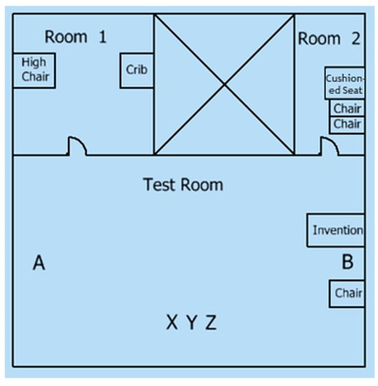 For test 1, the time usage and efficiency of the proposed invention is tested. The test mainly focuses on the conversion time of the proposed invention in comparison with conventional furniture. This is significant for evaluating the practicality and convenience of the proposed design. The result will help determine whether the process of repurposing the furniture is efficient enough to encourage the adoption. Two scenarios are created to test the invention. Each scenario is tested with a control and test group. Figure 4 shows the illustration of the test scene. Room 1 contains a highchair and a crib. Room 2 contains a cushioned seat and two chairs. Lastly, the test room contains the proposed invention and a chair.