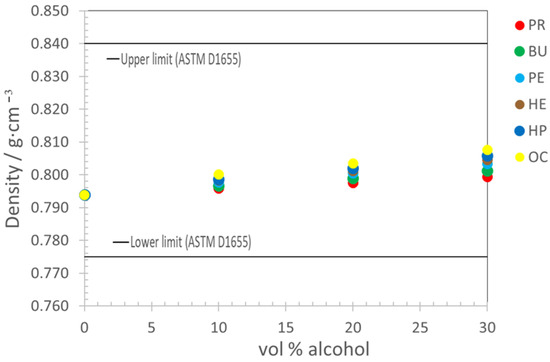 The comparison of density at 288.15 K of mixtures as a function of volume alcohol % with the ASTM D1655 standard limits for the density.