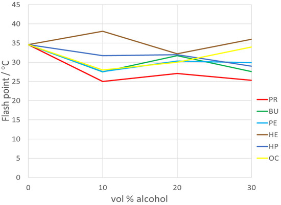 As it can be observed from Figure 2, the flash point values for n-hexane and n-heptane are the closest to the value of Jet-A aviation fuel. This aspect makes them, from this point of view, the most suitable ones to be used for sustainable aviation fuel blends.