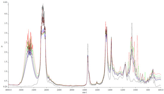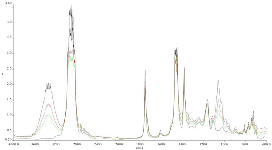 As it can be observed, (−OH) absorption occurs between 3650 and 3150 cm−1 and as the alcohol number of carbon atoms increases, the absorbance decreases. This is due to the fact that more carbon atoms are interfering with the adsorption process. Nevertheless, the presence of oxygen within the structure of the blends should translate into a better combustion process, since the fuel requires less air to burn and uses its internal oxygen. Another important difference is shown between 2850 and 3000 cm−1 where saturated systems (alkanes) show activity, and as the number of carbon atoms within the alcohol structure increases, the absorbance increases too. At 1450 cm−1, the presence of methylene groups (−CH2) is showing a slight increase as the number of carbon atoms of the alcohol increases since more and more (−CH2) groups are present in the structure. Another large difference is shown at 1000 cm−1, representing the C−OH bond. As in the case of –OH, as the number of carbon atoms of the alcohol increases, C−OH increases.