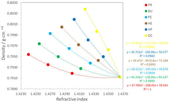 Figure 5 illustrates the correlation between the density and refractive index for the studied pseudo-ternary mixtures. The figure includes the correlation equations and coefficients of determination (R2) for each mixture. As observed, all correlations are polynomial, enabling the rapid estimation of density from the refractive index for any composition of the Ke/alcohol mixture. It is evident that the density of mixtures decreases as the refractive index increases. R2 values exceed 0.99 for all mixtures. The point corresponding to pure Ke is consistent across all correlations. However, the points for each n-alcohol diverge, aligning with the values presented in Table 4 and Table 7.