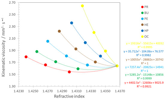 Correlation between kinematic viscosity and refractive index for PR, BU, PE, HE, HP, and OC; • experimental values; − calculated values with Equation (5).