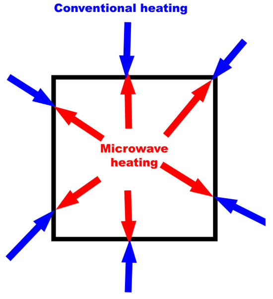 The microwave-assisted process works by exposing the material to microwave radiation, which causes the molecules to heat up and react (Figure 2). The microwave radiation is absorbed by the material, causing the molecules to vibrate and rotate, which generates heat. The heat is then used to drive the chemical reaction, allowing for faster and more efficient processing [30].