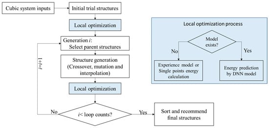 Structure search flowchart of the EOA module for the cubic crystal system, with “Local Optimization” for selecting stable structures from GA outputs.