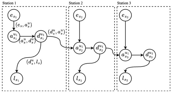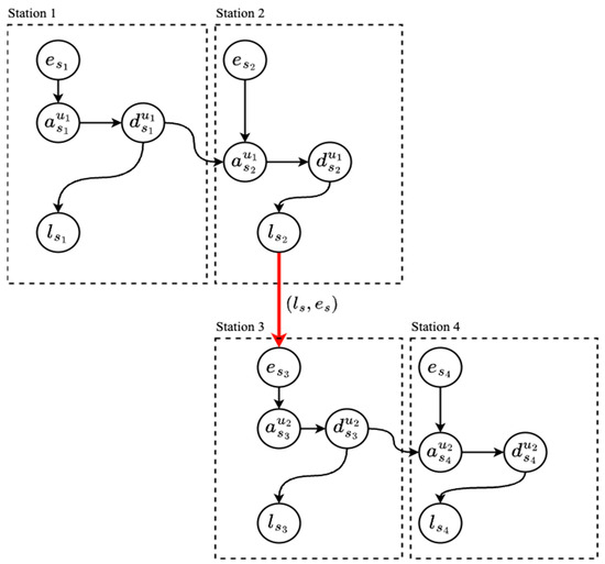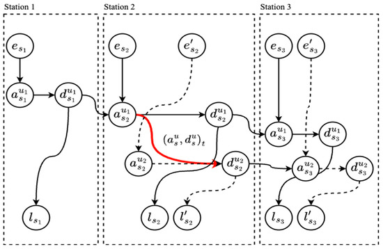 In Figure 1, the occurrence times of events like and are determined by the timetable. The latest arrival time of event is determined by the actual time needed for passengers to enter station and , the time of occurrence of the event . The earliest departure time of event is determined by the actual time needed for passengers to leave station and , the time of occurrence of the event .