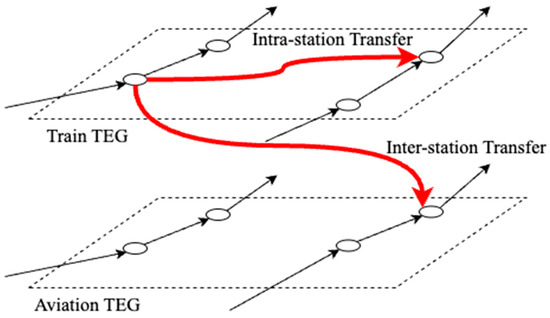 Based on the train and airplane schedules generated for TEG, they are independent of each other, and we cannot get the air–rail intermodal route out of two separated TEGs. We establish transfer edges that connect nodes both within the same TEG and across different TEGs, thereby facilitating air–rail intermodal travel path planning. Establishing transfer edges can create potential quicker paths by transfer between different stations, breaking the constraints of same-station transfers to support the generation of more optimal travel plans. An example of a TEG graph with transfer edges is illustrated in Figure 2.