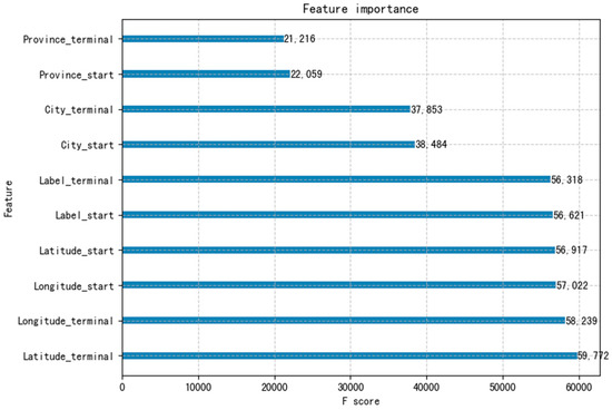 Figure 7 illustrates that as the number of selected features increases, the evaluation indexes of the model exhibit significant improvement. However, when the number of selected features exceeds four, the improvement in the evaluation indexes becomes negligible. Therefore, we select the first four features, namely the latitude and longitude of the start and terminal stations, for subsequent model training.