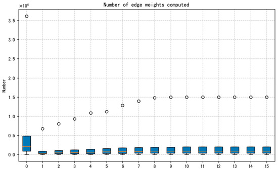Figure 8 shows that, during the path planning calculation process for 1000 OD samples, the maximum number of edges that require weight computation is relatively large, and the distribution is concentrated in most cases. After acceleration with the XGBoost model, the maximum value has significantly decreased, the data distribution has become more concentrated, the box has noticeably shrunk, and the median has also decreased markedly.