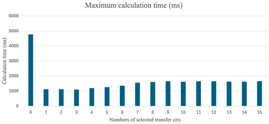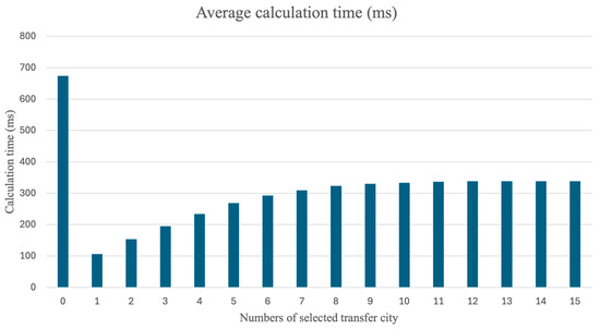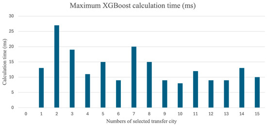 Figure 11 shows the maximum XGBoost prediction calculation time needed among all 1000 OD pairs. It is noteworthy that the time required to execute XGBoost predictions in the path planning calculations remains constant regardless of the number of cities selected for transfers. This observation underscores the efficiency of XGBoost in providing rapid predictions irrespective of the complexity introduced by the number of transfer cities.