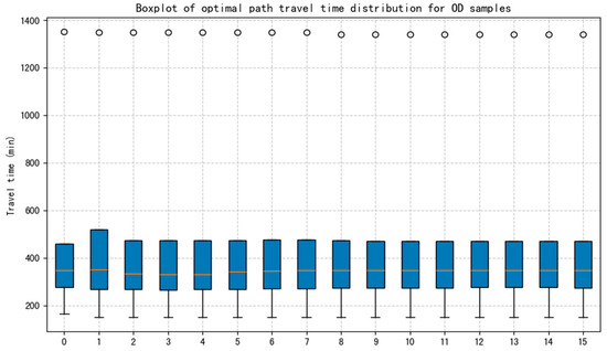 To assess the influence of XGBoost’s network refinement on the quality of path planning outcomes, a comparative analysis was conducted. This analysis focused on following three aspects: distribution of travel time for optimal paths of OD samples, the average number of viable paths within the sample results and the proportion of resolvable OD pairs in relation to the original dataset. Through comparative analysis, insights were gleaned into how the refined network affects the diversity and feasibility of path planning options, as well as the algorithm’s ability to provide solutions across a range of OD queries. This evaluation is crucial for understanding the trade-offs between computational efficiency and solution quality in the context of air–rail intermodal path planning.