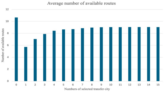 Figure 13 shows the average number of available paths the algorithm can get when the number of OD pairs is 1000; it is evident that without XGBoost the algorithm can get about 10 paths. After using XGBoost, this average reduces to around eight paths. Furthermore, it is observed that as the number of selected cities for potential transfers decreases, so does the average number of available paths. Conversely, an increase in the number of selected cities leads to a corresponding increase in the number of viable paths. However, once the number of selected cities surpasses nine, the average number of available paths stabilizes, indicating that further increases in the number of cities do not significantly enhance the diversity of path planning options. This finding suggests an optimal balance between the number of transfer cities and the richness of the solutions, highlighting the importance of judiciously selecting the number of cities to include in the path planning strategy.