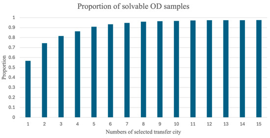 Figure 14 demonstrates the impact of using XGBoost on the proportion of OD pairs that can still obtain optimal paths, it can be seen that as the number of selected cities increases, the proportion of solvable OD pairs also rises. When the number of selected cities exceeds nine, the proportion of solvable OD samples no longer increases significantly. When using XGBoost acceleration and selecting more than nine cities, approximately 98% of the samples can still obtain valid routes.