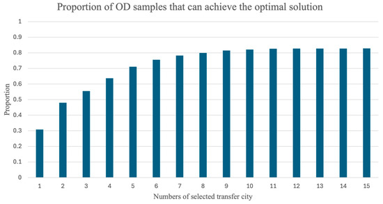 Taking the path planning results without using XGBoost as the optimal solution, it can be observed in Figure 15 that when merely one city is chosen for transfers, a mere 20% of the samples attain the optimal solution. As the number of selected cities for potential transfers grows, so does the percentage of samples that successfully reach the optimal solution. Once the number of selected cities surpasses ten, the proportion of samples achieving the optimal solution does not increase significantly. At this juncture, approximately 83% of the samples are able to secure the optimal solution.