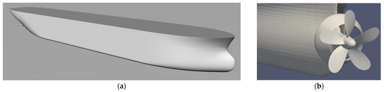Ship and propeller model [1]: (a) the hull with bulbous bow; (b) propeller and stern duct.