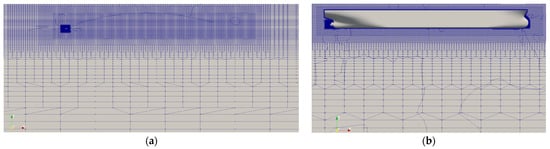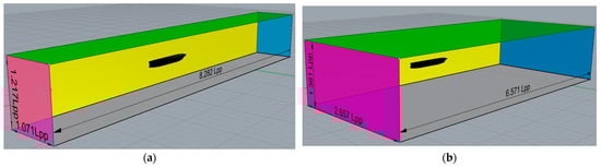 Each domain in Figure 2 consists of seven boundary faces which are identified by colors. The black, purple, blue, green, yellow, and grey faces correspond to the solid surface, inlet, outlet, top, side (starboard), and bottom boundaries, respectively. In Figure 2a, the transparent face is the mid-plane boundary laying on y = 0, i.e., the ship’s center plane. In Figure 2b, the transparent face is another side boundary (portside). The boundary conditions shown in Table 1 are specified on the above-mentioned boundaries. Those condition names are the standard defaults in OpenFOAM.